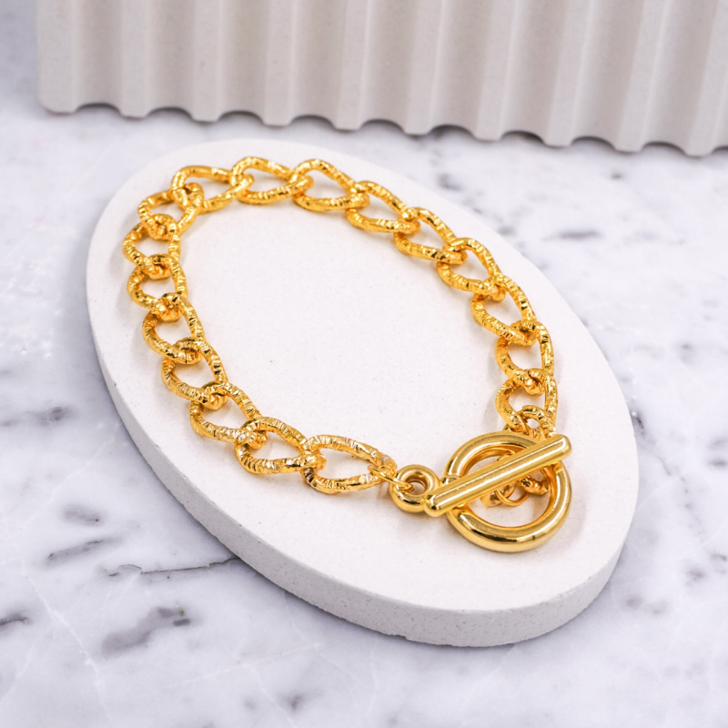 hermosa pulsera dorada en material aluminio super liviana y de buena durabilidad