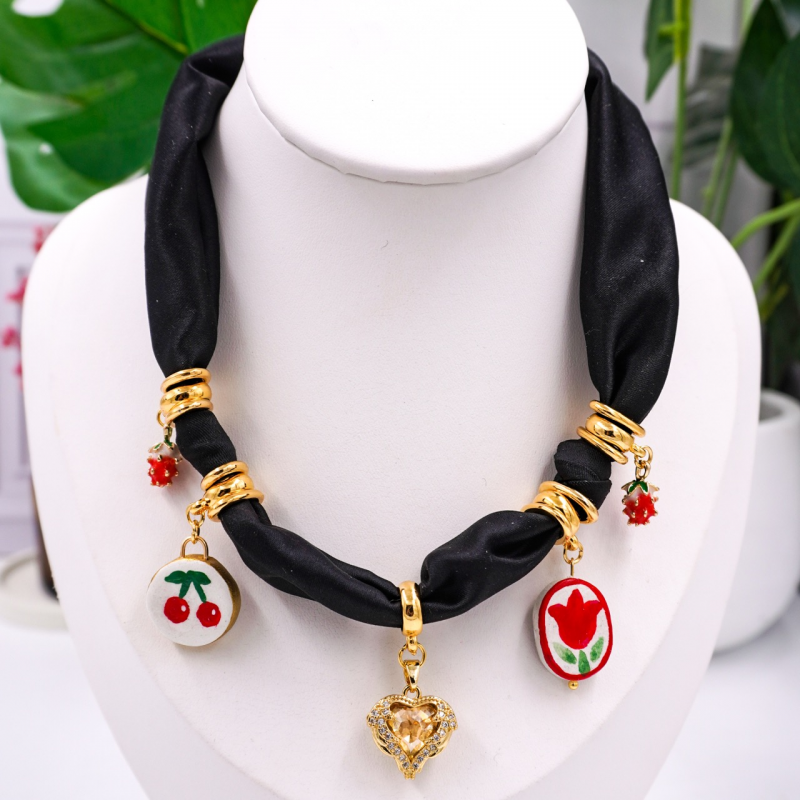 hermosos collares realizados con pañoletas o bandana con dijes de porcelana