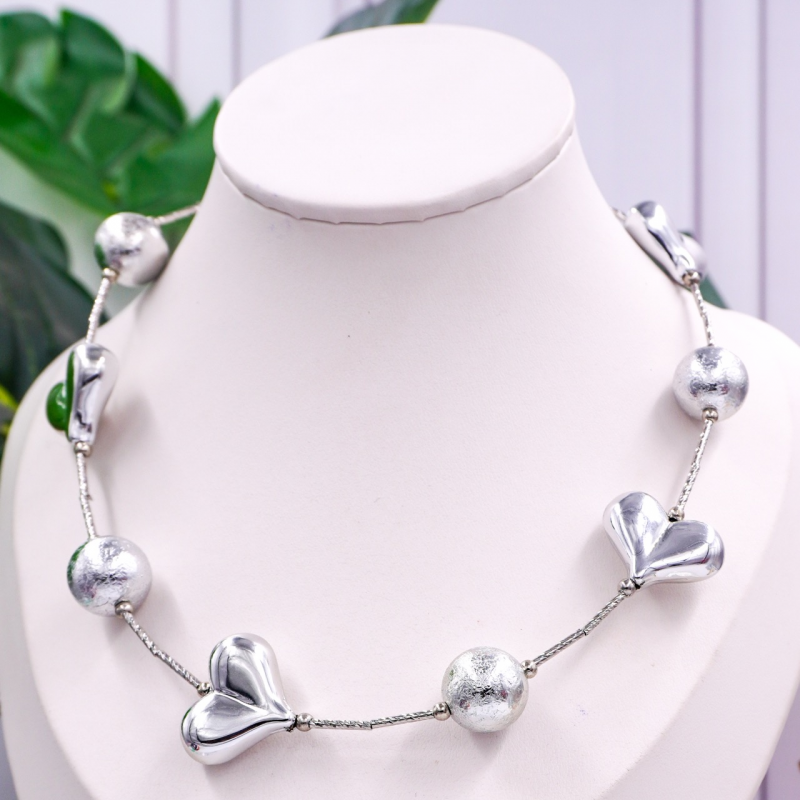 COLLAR CORAZON Y PERLA PLATEADO X UNID